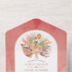 Tropical dried palm leaves, pampas grass and protea flowers pink arch all in one wedding invitation. This lovely wedding design features an arch frame on pink stained background and detached RSVP card. In the frame there is a bouquet of dried palm leaves, protea flowers and pampas grass.