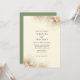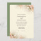 This boho wedding invitation features graphics of dried palms and blush coloured flowers on a light cream coloured background. The backside of the invite is a solid sage green colour.
