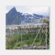 A photograph depicting fish drying in the fresh air of Lofoten islands in Norway. In the background misty mountains protecting the nearby harbour.