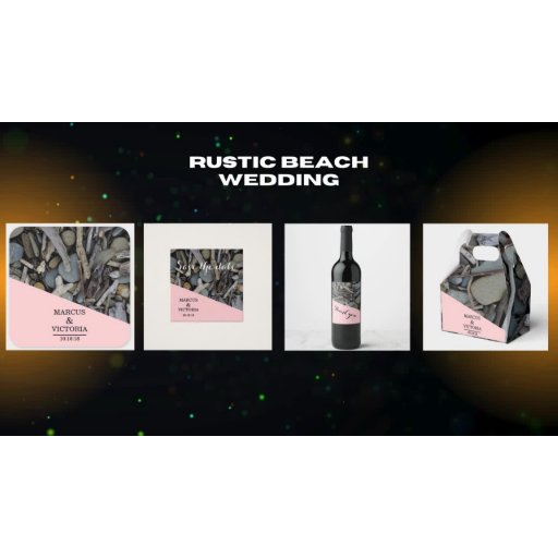 A save the date design that can be customised with the bride and grooms names. The background is a collage of a pink banner and a photo of beach stones and driftwood.