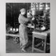 Old 1910s photo of woman in work jumpsuit using drill press to make ammunition cartridges for WWI war effort.