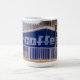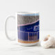 Drink COFFEE sleep later - In worn white letters on a cobalt blue background painted on a brick wall, the sign in the original photograph on this Coffee Mug says it all to coffee lovers. The little shop, with a palm tree in front and a thatched roof behind, is basking in the afternoon sunlight.