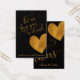 The background of this elegant, cheerful drink ticket can become any colour you choose. In a festive, elaborate script font, the words "let us buy you a drink" appear on the front of this modern drink ticket. The beautiful text has been embellished with a faux gold foil effect. "Good for One Adult Beverage" was added to the editable text field in a complementary serif font at the bottom. Use any other words you like, if you want to change the copy. On the back the beautiful graphic text overlay reads "cheers" and a template place holder was added for your names. On both sides a matching, asymmetrical, gold heart peeks in from the edge. The editable background is black in this example; change it to any colour you prefer. All layers are unlocked so you can resize or re-position any part of this card that you like, should you want to tweak the design. Please do not hesitate to reach out if you have requests or need customising assistance.