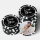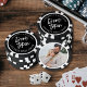 These custom poker chips feature your photo on one side for a personal touch, making them a unique keepsake. The text side is designed with a reversed color look, featuring a light background with dark fonts for a clean, high-contrast finish. The bride and groom’s names appear at the top, “Drink Token” is displayed in the center, and “One Free Well Drink” is placed at the bottom.