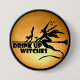 Design with the saying "Drink up Witches" featuring a witch on a broom with a cat and a martini.