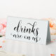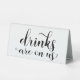 A bar sign notifying guests that the drinks are on the house, being paid by the bride and groom.