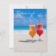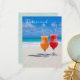 Drinks on the beach thank-you custom blank flat note cards. Two tropical cocktails sit on a sunny beach with turquoise water in the background. White script is easy to change, or delete. Reverse contains a background water image but has no text. This little card is perfect for personal use or to send from a newlywed couple. Choose any size - check to see if the design fits correctly - and upgrade to a speciality paper if you choose.