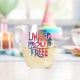 This Drinkware Style: Stemless Wine Glass, the message "United Proud Free" in a vibrant multicolor gradient. Each word smoothly transitions into the next, creating a dynamic and eye-catching design
