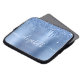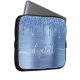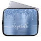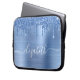 Personalised chic and girly laptop sleeve featuring blue faux glitter dripping down a blue faux metallic foil background. Monogram with your name in a stylish trendy white script with swashes.