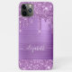 Custom elegant and girly phone case featuring purple faux glitter dripping against a purple faux metallic foil background. Personalise with your name in a stylish trendy white script with swashes.