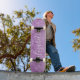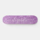 Custom girly skateboard featuring dripping purple faux glitter. Personalise with your name in a stylish trendy white script with swashes.