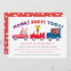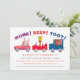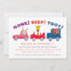 Cute birthday party invitation template card featuring illustrations of animals (bunny, giraffe, and bear) in cards and trucks in a parade. This invite was created for kids that are keeping social distance and in quarantine to still have a way to celebrate their special day! This is a gender neutral design.