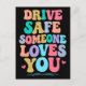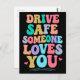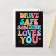 Warm reminder message with colorful hand lettering on a dark background. A gentle and emotional phrase that encourages safe driving and shows care, love, and connection for family, friends, and loved ones.