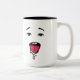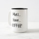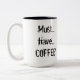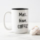 Funny drooling face mug that says "Must...have...COFFEE!" Hand drawn cartoon graphic.