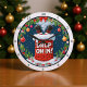 This is a cheerful, circular-framed graphic design for the holiday season. The central image features Santa's legs and black boots comically sticking out of a red brick chimney on a snowy rooftop. The text "DROP ON IN!" is prominently displayed on the chimney in bold, white letters. The entire scene is framed by a festive green wreath decorated with red berries and a red bow. The background is a dark blue night sky with stars, giving the design a cosy, wintery feel.