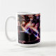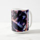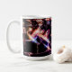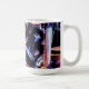 Gifts for drummers - The artwork on this Mug is an original photograph by ZoeSPEAK of a drum set. The shiny black drums with their silvery rims reflect the colours of the lights in the studio, blues, reds and greens. Cymbals above the drums wait to be struck.