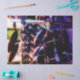 The artwork on this Tissue Paper is an original photograph of a drum set. The shiny black drums with their silvery rims reflect the colours of the lights in the studio, blues, reds and greens. Cymbals above the drums wait to be struck.