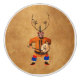 A northern shaman, wearing buckskin clothing and caribou (reindeer) antlers, performs a drumming ritual to communicate with spirits and travel between realms. The shaman is superimposed on an old brain tanned leather background image.