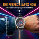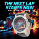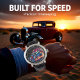 This dynamic watch face features two custom hot rod cars, one prominent in blue with orange flames, and another smaller, pink one in the background. Both vehicles are surrounded by vibrant, stylised flames and are set on a dark, reflective surface suggesting intense speed. The overall design is a powerful and bold celebration of classic car culture.