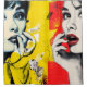 Two women are depicted in a vibrant, pop art style, one in shades of blue and yellow and the other in grayscale with bold red lipstick. The background features a mix of abstract patterns in red and yellow tones.