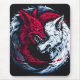 Two hyperrealistic wolves, one crimson, one ivory which mirror the ancient yin-yang, symbolising primal balance, unity in contrast, and wild harmony within a cosmic wilderness.