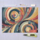 The composition is split into two main sections, each dominated by a large circular form that seems to be in motion. This creates a sense of balance and contrast, reflecting the concept of duality. The colour palette is a harmonious blend of primary colours—red, yellow, and blue—accentuated with shades of beige. These colours are thoughtfully combined to create a vibrant and cohesive look.