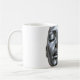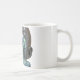 A small green metallic female android in front of a large chrome android face with closed eyes, printed on a white mug.