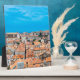 Painting of red rooftops and blue sea from Dubrovnik city wall, Dubrovnik, Croatia. View from above of old town center.