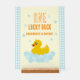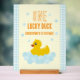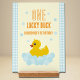 One lucky duck! First birthday featuring a rubber duck and bubbles against a light blue gingham and pale yellow background with orange text
