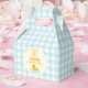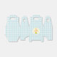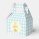 One lucky duck! First birthday featuring a rubber duck and bubbles against a light blue gingham and pale yellow background with orange text