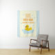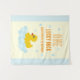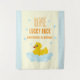 One lucky duck! First birthday featuring a rubber duck and bubbles against a light blue gingham and pale yellow background with orange text