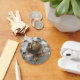 This awesome keychain features a photograph of a beautiful brown duck with a bright orange beak. The duck is standing on a wall overlooking a lake and looks like it is deep in thought.