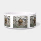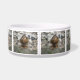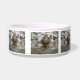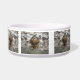 This awesome pet bowl features a photograph of a beautiful brown duck with a bright orange beak. The duck is standing on a wall overlooking a lake and looks like it is deep in thought.