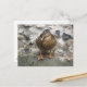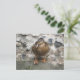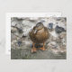 This postcard features a photograph of a beautiful brown duck with a bright orange beak. The duck is standing on a wall overlooking a lake and looks like it is deep in thought.
