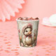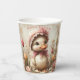 Paper Cups with a white baby duckling sitting in a garden of Spring Daisies and Tulips. She is wearing her favourite pink bonnet and bow around her neck.