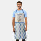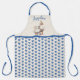 Ducks and blue hearts bib apron. Choose the long or short version and add her name in blue at the top. Two white ducks decorate the off-white bib portion. The lower part of the apron is covered in a pattern of blue hearts. Neck strap and ties are also matching blue.