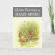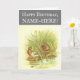 The front of this vintage look birthday greeting card design features a depiction of ducks near some water, along with a customisable name and message. The inside features a personalised birthday greeting message. A birthday greeting card like this might be used to send a birthday greeting message to somebody who is celebrating their birthday.