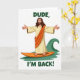 This card features a cartoon-style spiritual figure with flowing brown hair, a trimmed beard, and a gentle smile, dressed in a cream tunic with an orange sash. Centered on the front, he stands with arms outstretched as if greeting a friend, riding an orange surfboard across an emerald-green wave 🐇. The warm cream and orange tones contrast with the cool green water and a bright white background, giving the scene a crisp, modern look. The figure’s relaxed posture and kind expression add a friendly, companionable feel, like an inside joke shared between close pals 🌷. At the top, the word “DUDE,” appears in dark green uppercase letters, spaced above the character. Near the bottom, “I’M BACK!” is set in matching dark green uppercase text, anchored beneath the surfboard and wave. The wave curls in a simplified shape with white foam accents, framing the board against the open white space.