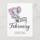 Adorable baby girl elephant with pink polka dot ears and tiny pink bow over ear, "Due in February" typography, and template for special message announcing pregnancy.