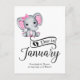 Adorable baby girl elephant with pink polka dot ears and tiny bow over ear, "Due in January" typography, and template for special message announcing pregnancy.