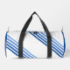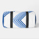 Blue lines in varying five shades Dark to light, bottom to top. Two Sets of stripes are placed diagonally, meeting at the centre of top and bottom of bag. End panels are the darkest shade of blue.