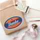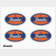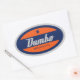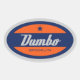 Oval signage design featuring the neighbourhoods of New York City. Official orange and blue colours of NYC. Down under the Manhattan Bridge overpass. Dumbo neighbourhood of Brooklyn.