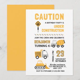 Construction Truck Theme Birthday Party Invitation