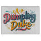A whimsical and playful design featuring the text "Dumpling Duke" in a hand-drawn, colourful cartoonist font with swirling flourishes. The vibrant colours and playful typography create a sense of fun and excitement.