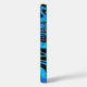 Cell phone case has a solid block of blue on one side and a swirl pattern in blue and black on the other side. Personalise with an initial, name or other text for a great gift idea. The name is in vertical orientation in black lettering.
