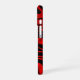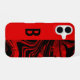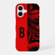 Cell phone case has a solid block of red on one side and a swirl pattern in red and black on the other side. Personalise with an initial, name or other text for a great gift idea. The name is in vertical orientation in black lettering.