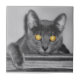 A photograph looking straight in the face of a grey cat with golden glowing eyes. Edited with selective colouring to emphasise the mesmerising eyes.