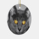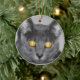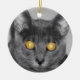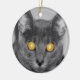 A photograph looking straight in the face of a grey cat with golden glowing eyes. Edited with selective colouring to emphasise the mesmerising eyes.
