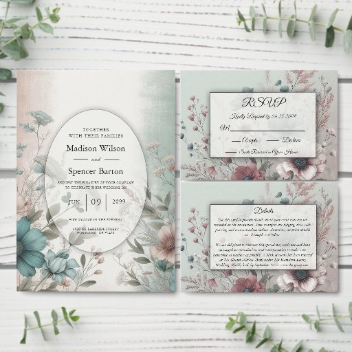 Elegant and softly enchanting, this floral wedding invitation features delicate watercolor blossoms in dusky rose and muted teal hues, beautifully balanced against a faded vintage background. The centre area is lightly washed to highlight your custom wedding text, making it perfect for romantic garden weddings, vintage-inspired celebrations, or any couple who adores graceful botanical charm. A timeless blend of sophistication and serenity, this design captures love in full bloom.
