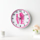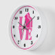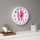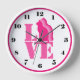 Declare your love for cats with this modern, simple clock that has a drawing of a dusky pink cat sitting, in silhouette, with pink shadows behind. The cat forms the 'O' of the word LOVE which is written in large pink stencil letters. The clock has a white background, black numerals and a co-ordinating dark pink border.